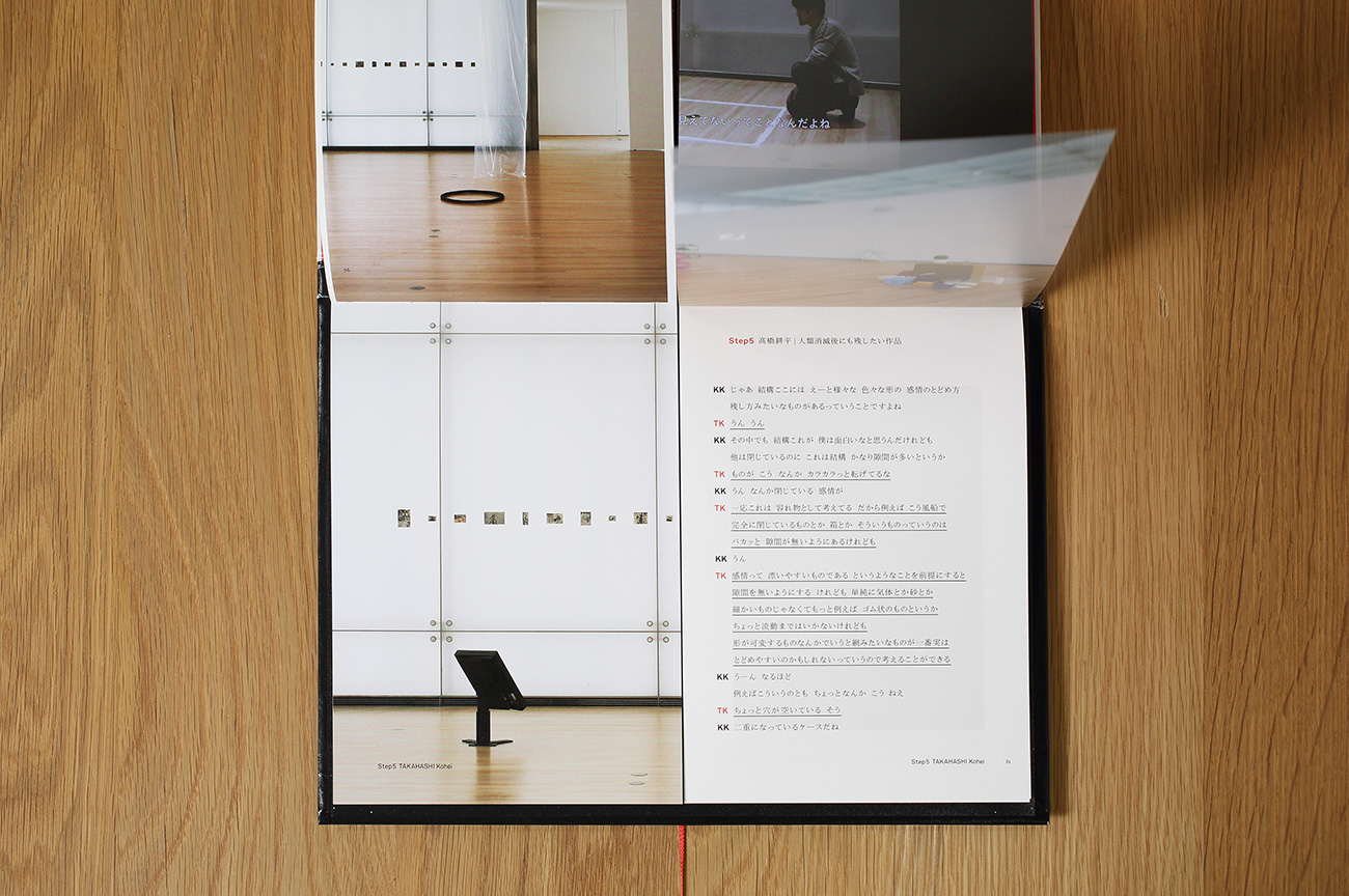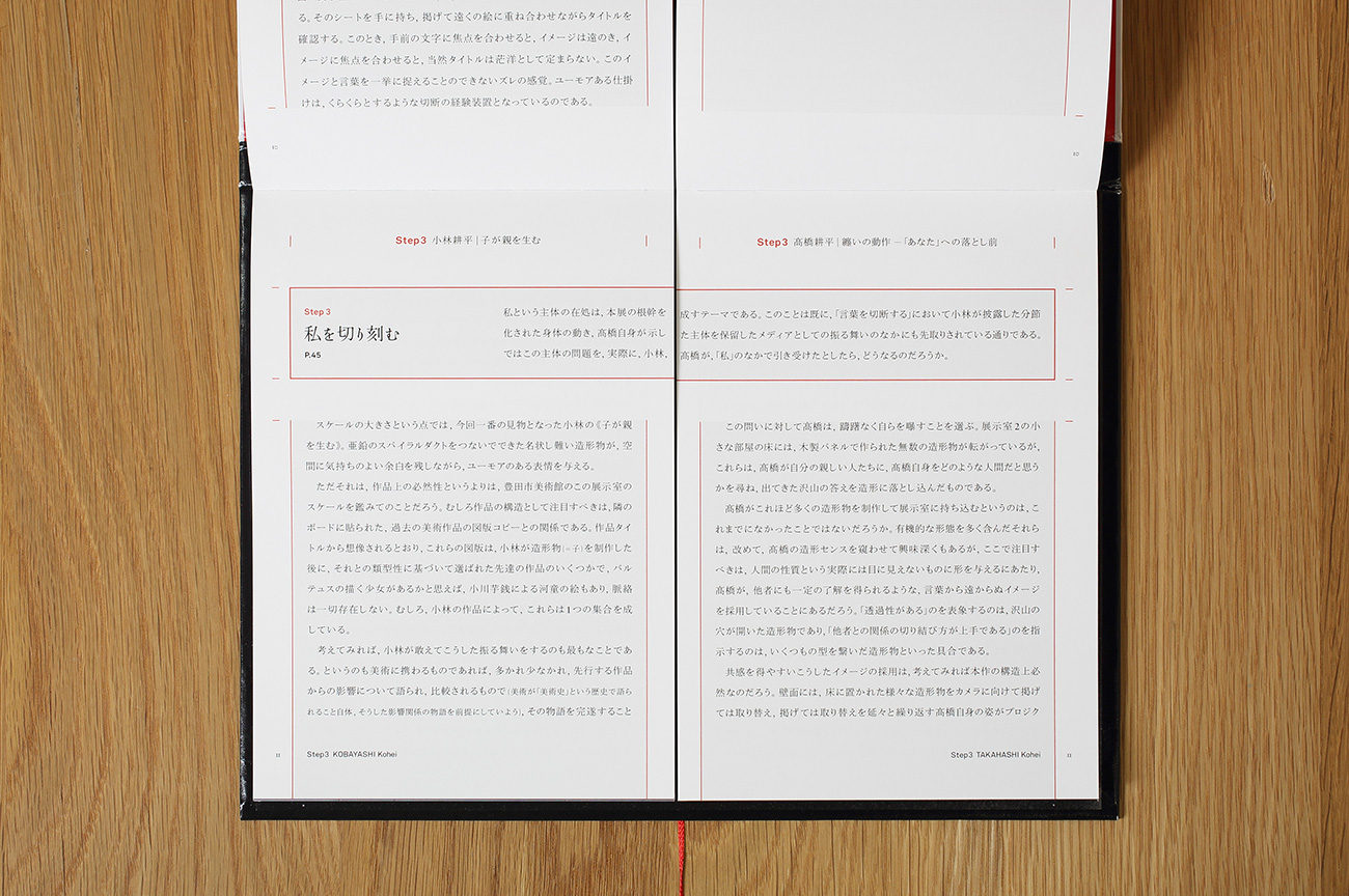 縦にまっ二つに切断された本。左側では小林耕平の作品が展開していき、右側では高橋耕平の作品が展開していく。ページを切断することによって新たな接続が生まれることを試みた。