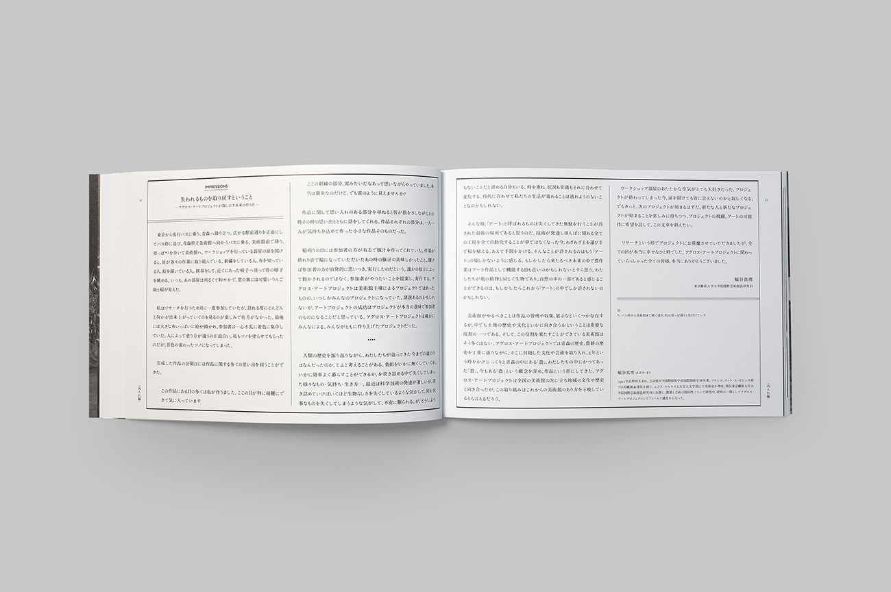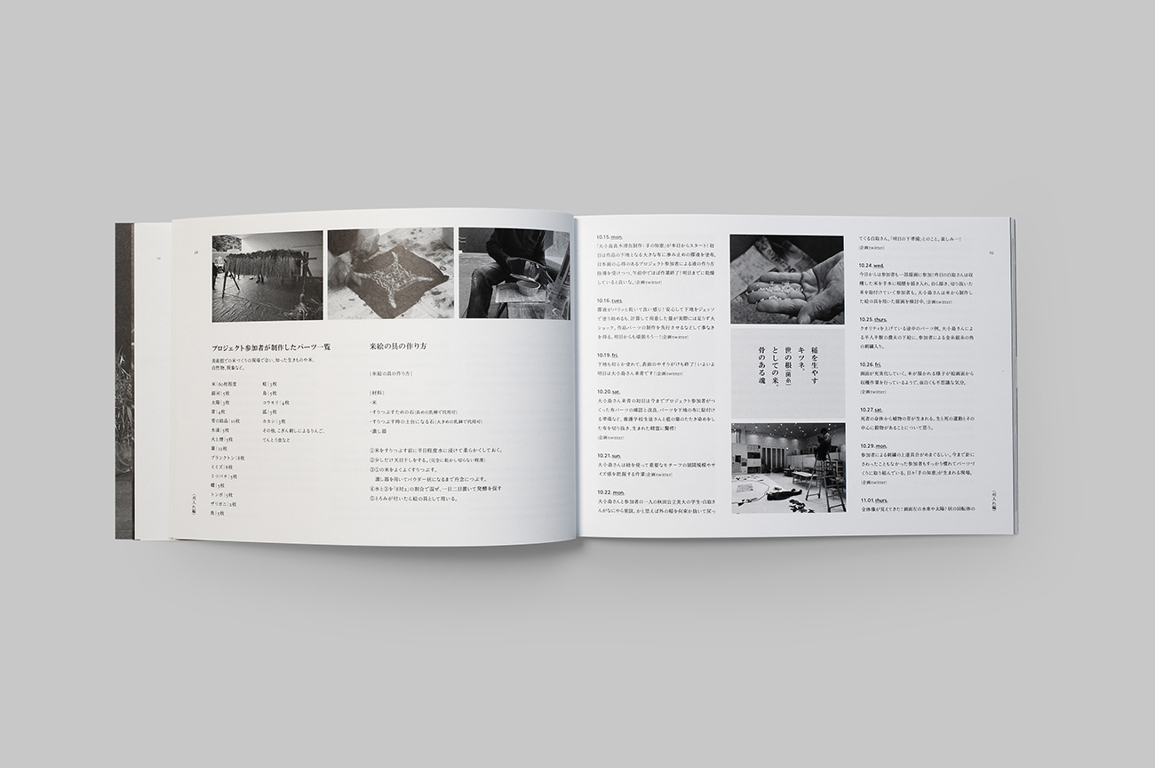 2017年から18年の2年間、青森県立美術館で実践された「米作り」を通じて、地域とアートの関わり方や可能性を追求したプロジェクトの記録集。米作りの過程で起こったことや「米」を素材にアート作品を作ることに対する議論が日記のように構成されており、2年間の実践による経験が、蓄積されていくごとに頁が進んでいく。「米作り」に欠かせない土。青森県立美術館独特の土壁の写真を表紙に使い、稲の写真を印象的に扱いながら、時間の進行と頁の進行を重ねあわせた。