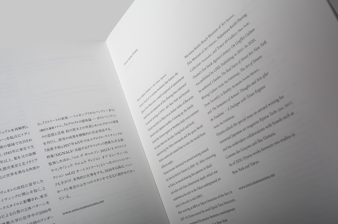 アーティスト・大山エンリコイサムによる展覧会「夜光雲」のカタログは、記録集ではなく、テーマでもある「夜光雲」を本という形で表現するコンセプト・ブックとなった。どのように「夜光雲」というテーマに行き着いたのかを大山のこれまでの軌跡を辿りつつ、大きく5つのキーワードに分けてまとめられた。ただし、エアロゾル塗料のぼけ味と同様に各キーワードごとに作品を明確に分けれるわけでなく、緩やかに連関していく様を造本によって表現しようと試みた。